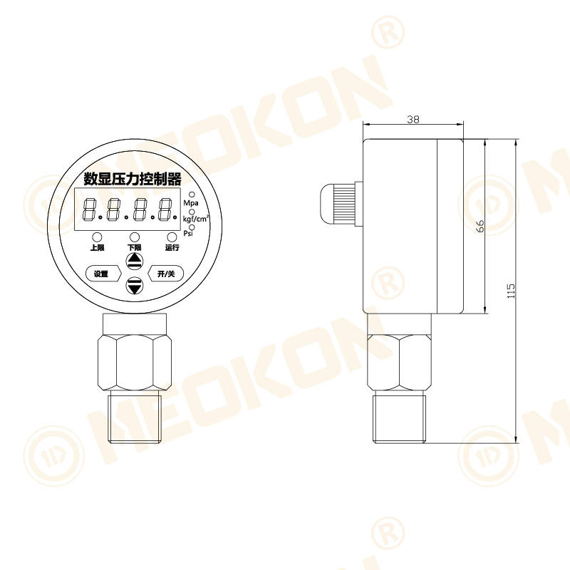 直徑60mm,0.5級,徑向安裝,LED數碼管顯示,304不銹鋼材外殼及接頭。 內置繼電器,可控制低壓閉合高壓斷開或反向控制,多種輔助控制功能。