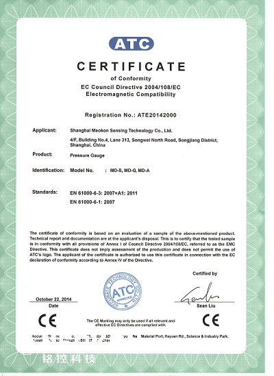 2014年10月,新款的MD-S280數字壓力表/MD-S200數字壓力表通過ATC實驗室CE認證。